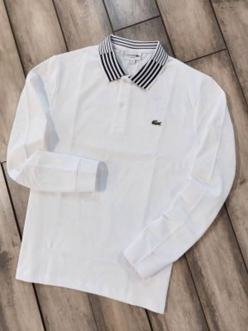 Lacost e White Premium Cotton Lycra Pique fabric Polo Full Sleeves Tshirt with Collar Design and Embroidered Logo 3295